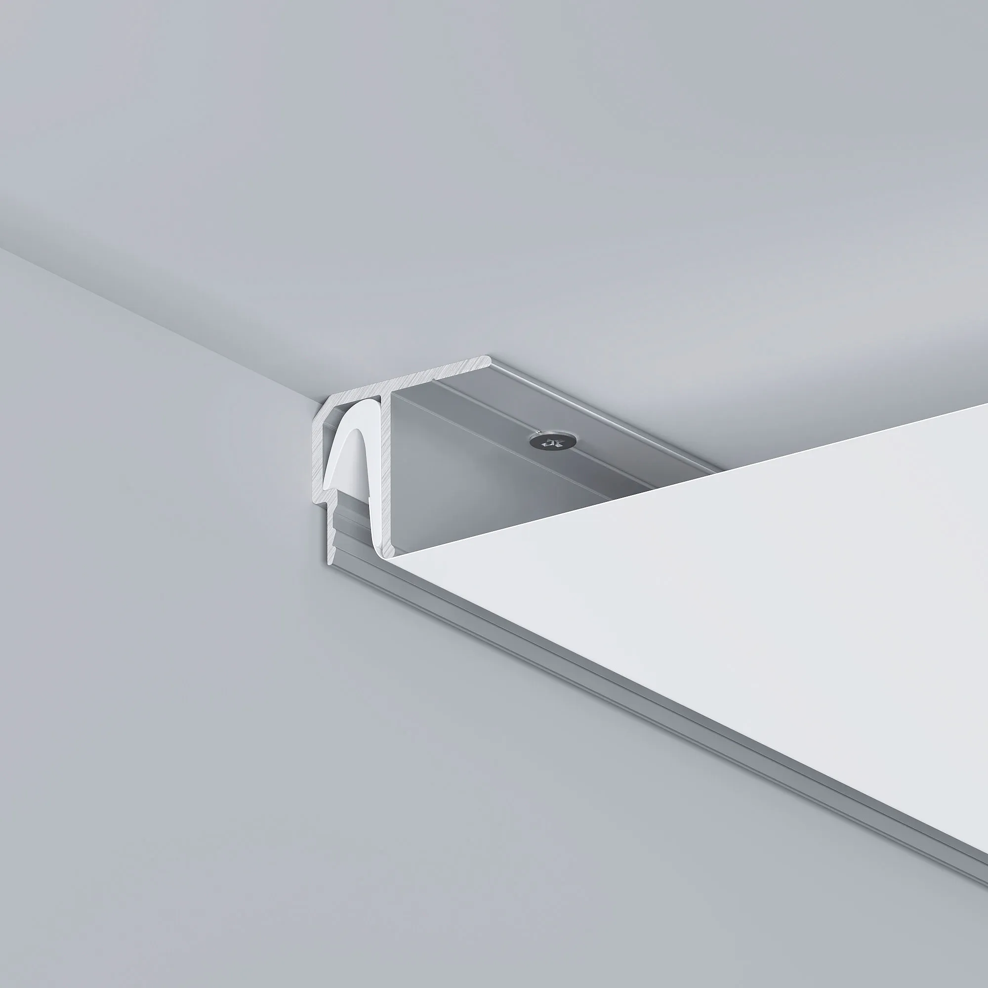 Алюминиевый профиль для установки натяжных потолков с использованием гарпунной системы. Габаритные размеры профиля составляют 2500 мм в длину, 21,5 мм в ширину и 18,55 мм в высоту.