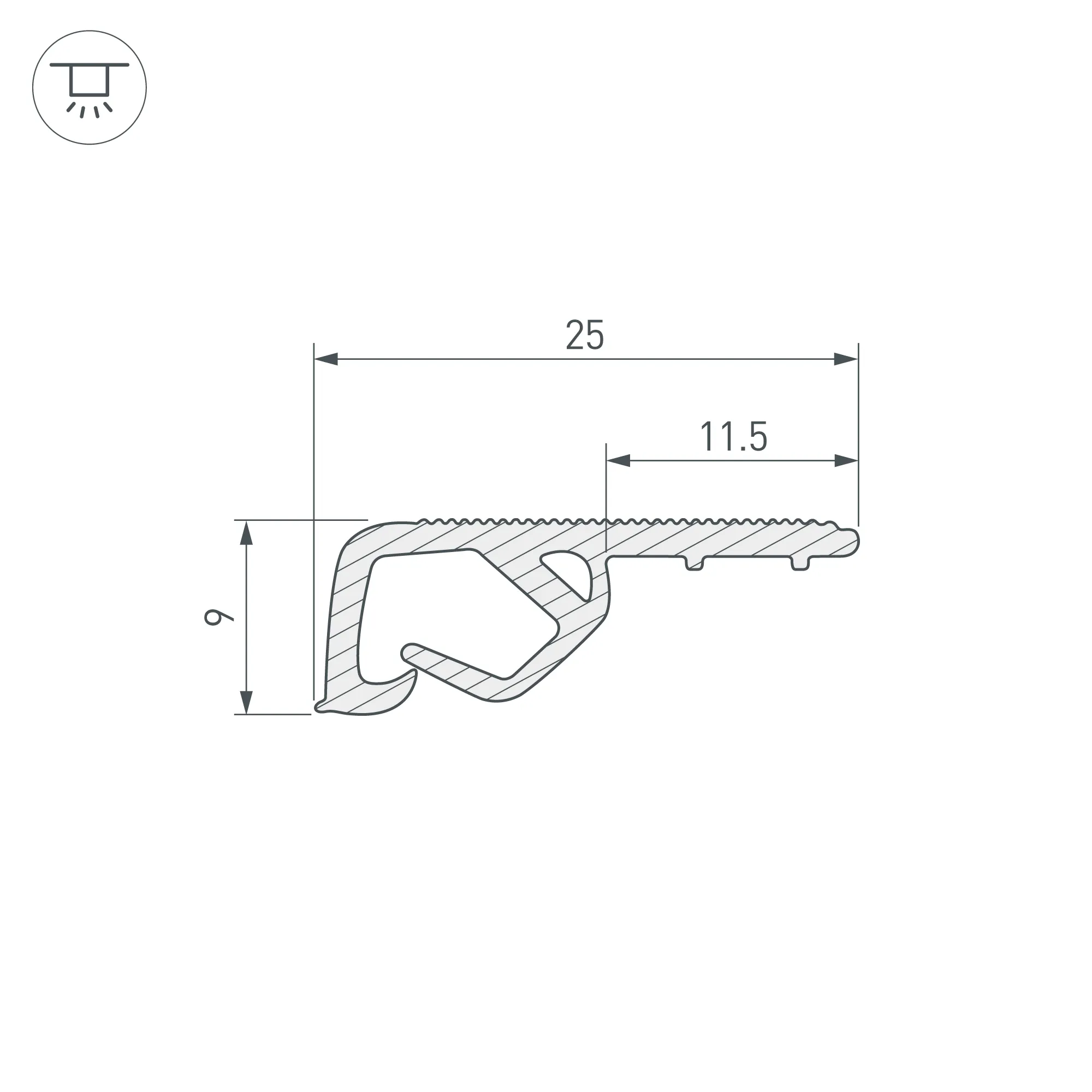 Потолочный профиль "прищепка" из ПВХ для монтажа тканевых натяжных потолков. Габаритные размеры профиля составляют 2600 мм в длину, 25 мм в ширину и 9 мм в высоту.