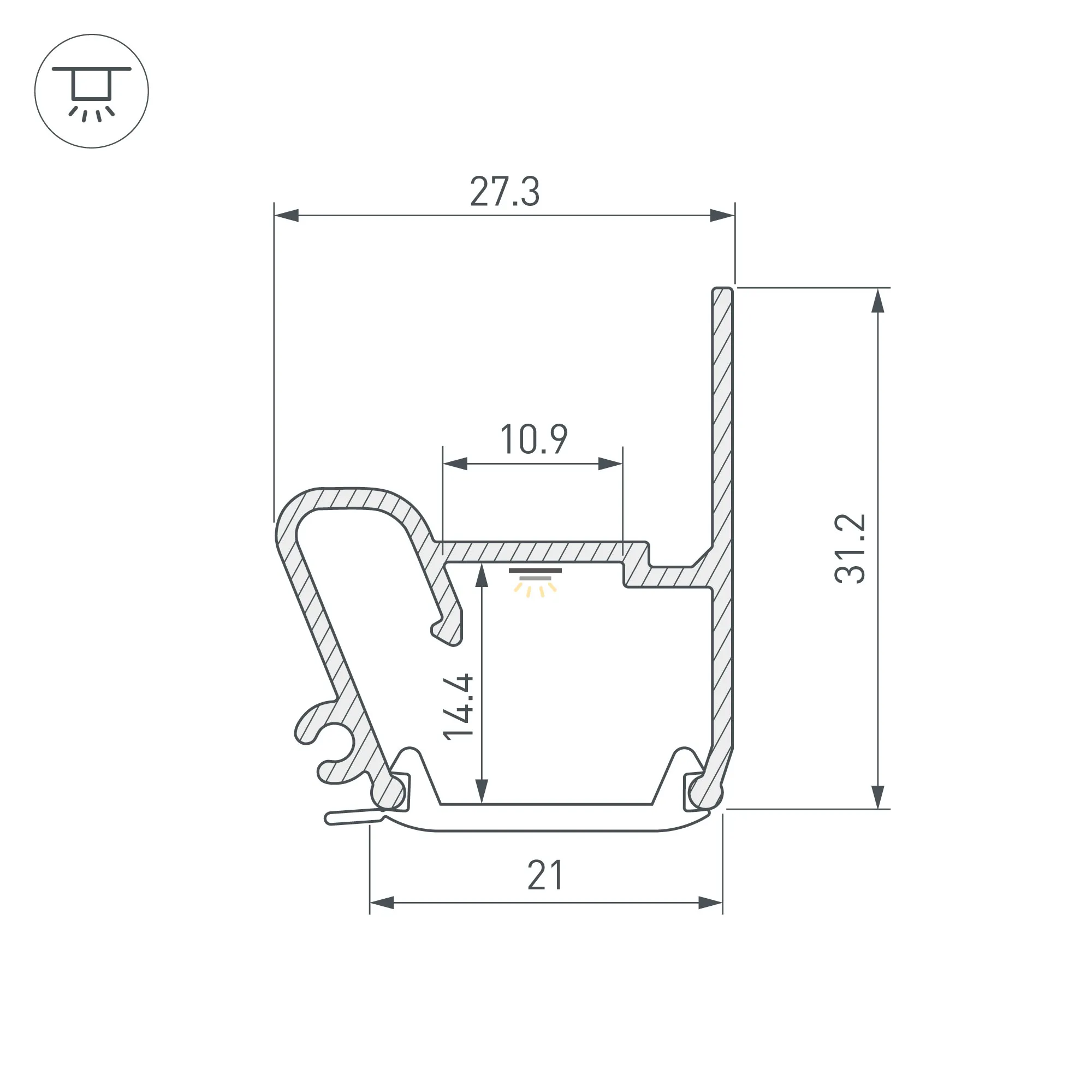 Габаритные размеры профиля составляют 2000 мм в длину, 27,3 мм в ширину и 31,2 мм в высоту. Площадка для установки светодиодных лент позволяет использовать ленту шириной до 10,9 мм и мощностью до 32 Вт/м. Это обеспечивает гибкость в выборе светодиодных лент и создает потрясающие световые решения.
