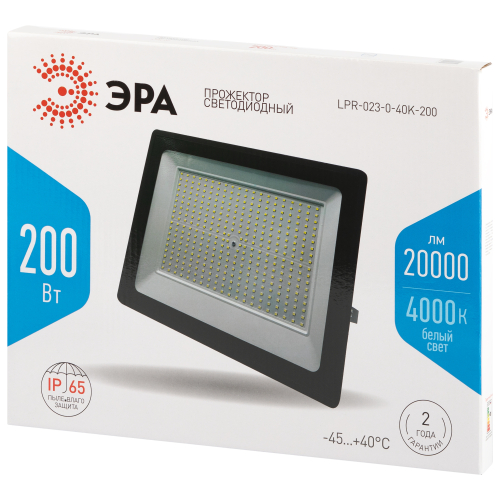 Мощный прожектор ЭРА LPR-023 200 Вт отличается удлинённым кабелем длиной 30 см, что упрощает подключение к распаячной коробке. Цветовая температура — 4000 К. Световой поток — до 20 000 лм. Прочный корпус из литого алюминия с порошковым покрытием оснащён закалённым стеклом, эффективно защищающим светодиоды. Количество светодиодов — 224.