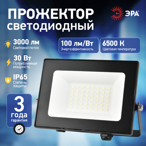 Профессиональный светодиодный прожектор ЭРА PRO LPR-062. Энергоэффективность — 100 лм/Вт, эффективная работа при низких температурах, повышенная защита от влаги. Мощность — 30 Вт. Световой поток — 3000 лм. Длина кабеля — 15 см.