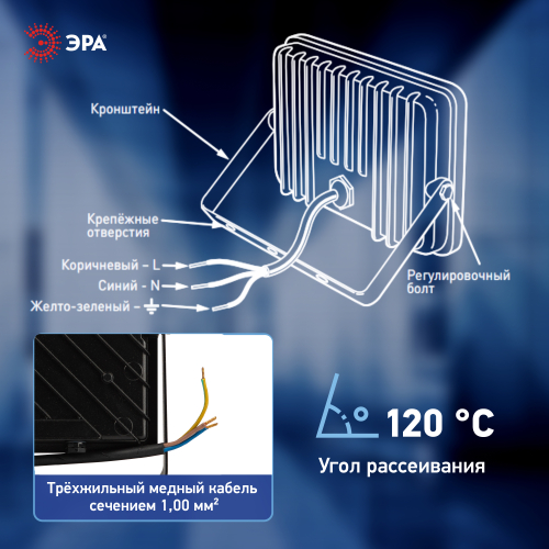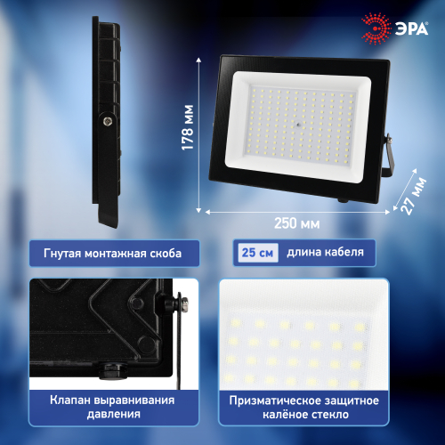 Серия ЭРА PRO LPR-062 объединила прожекторы с улучшенными характеристиками: энергоэффективность 100 лм/Вт, эффективная работа при низких температурах, повышенная защита от влаги. Корпус из литого алюминия с порошковой окраской. Светодиоды защищены калёным стеклом с призматическим эффектом, расширяющим световой поток. Цветовая температура — 6500 К. Гнутая монтажная скоба упрощает установку. Клапан выравнивания давления.