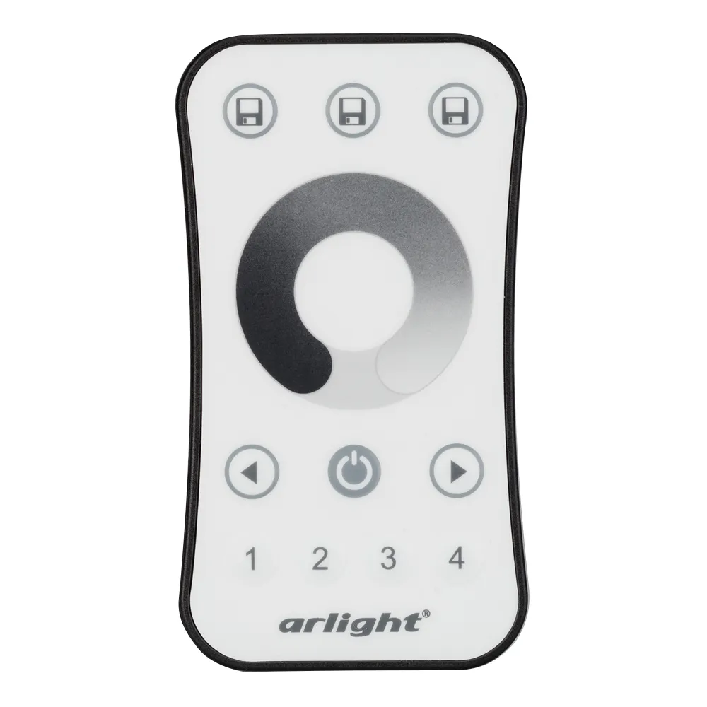 Кнопочный радиочастотный пульт белого цвета с сенсорным кольцом, предназначенный для управления одноцветными источниками света. Поддерживает основные функции: включение и выключение света, регулировку яркости, управление 4 световыми зонами, включение и выключение 3-х пользовательских световых сцен. Устройство совместимо с диммерами и контроллерами серии SMART, поддерживающими управление по радиоканалу 2.4G. К одному пульту возможно привязать неограниченное количество диммеров и контроллеров. Питание 3В осуществляется от батарейки CR2032. Корпус пульта выполнен из пластика, защищающего от загрязнения. Габариты устройства 107x58.5x9 мм.