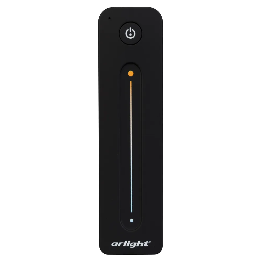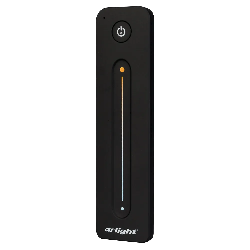 Радиочастотный пульт-слайдер чёрного цвета, предназначенный для управления мультибелыми (MIX) источниками света. Поддерживает основные функции: включение и выключение света, регулировку яркости, изменение цветовой температуры, управление 1 световой зоной. Устройство совместимо с диммерами и контроллерами серии SMART, поддерживающими управление по радиоканалу 2.4G. К одному пульту возможно привязать неограниченное количество диммеров и контроллеров. Питание 3В осуществляется от батарейки CR2032. Корпус пульта выполнен из пластика с покрытием Soft-Touch. Габариты устройства 139x36x11 мм.