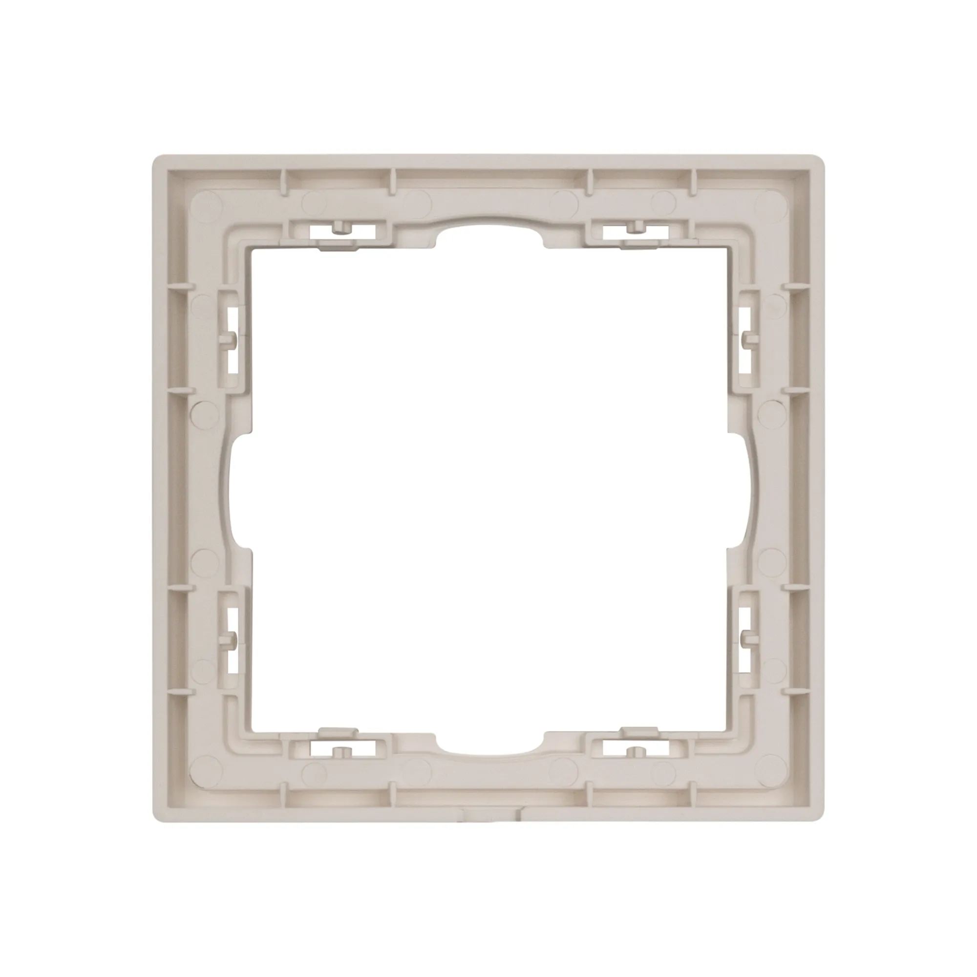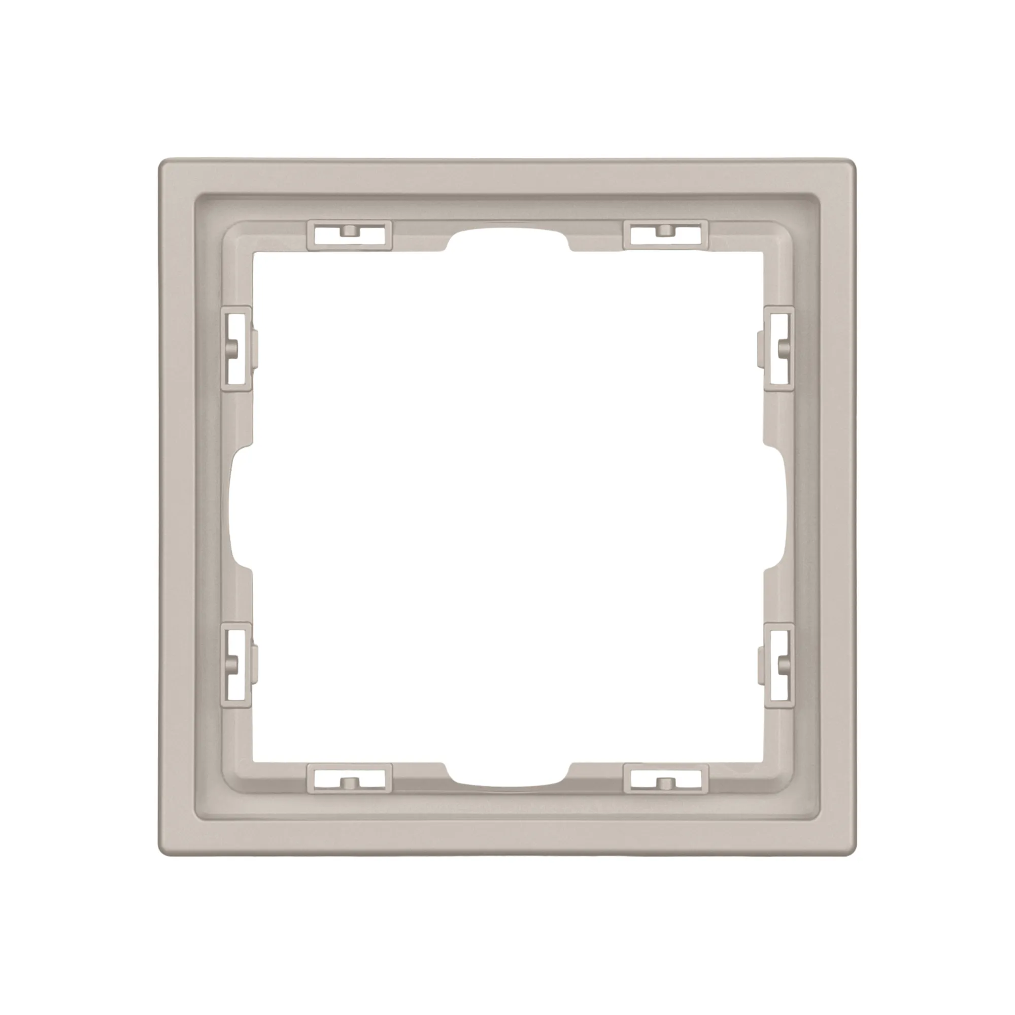 Корпус рамки выполнен в цвете кашемир и имеет покрытие Soft-Touch, что придает изделию приятные тактильные свойства. Толщина корпуса составляет 8,5 мм, что позволяет эффективно интегрировать рамку в интерьерные решения любого уровня сложности.