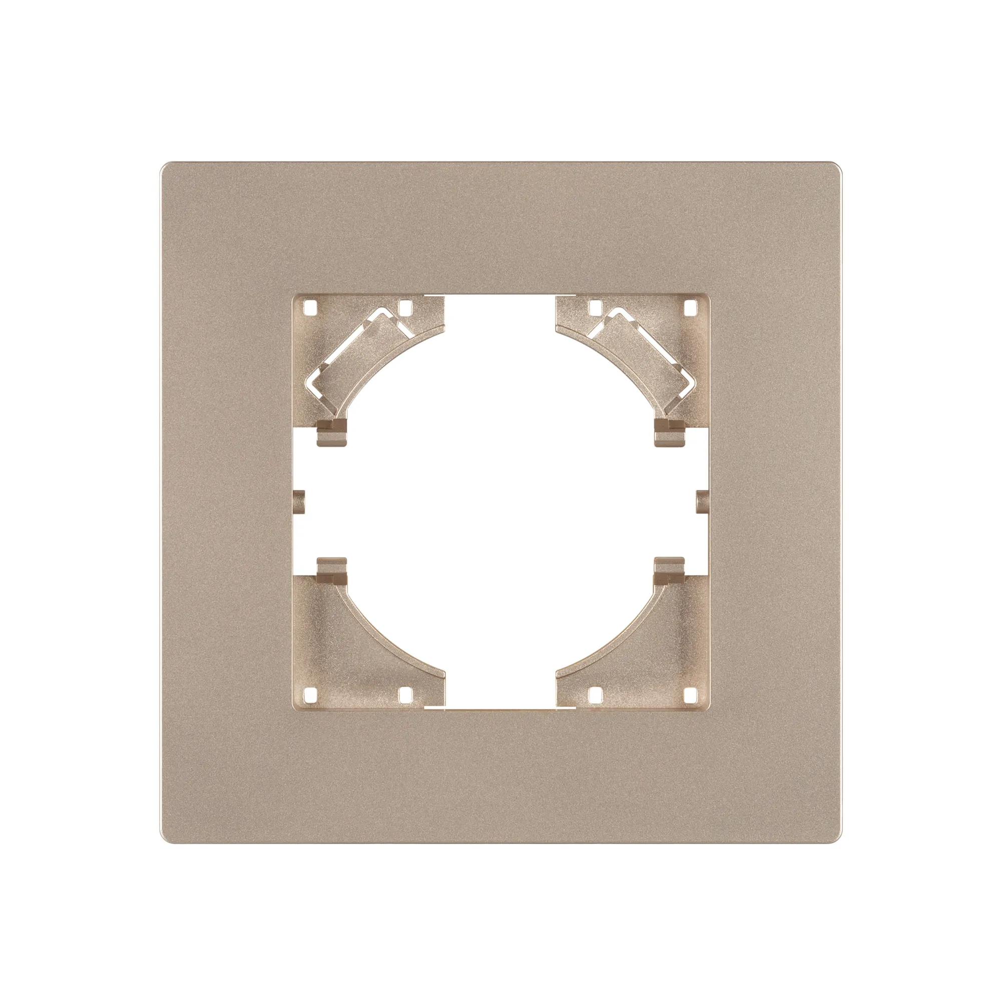 Рамка из серии PERIO изготовлена из высококачественного пластика. Корпус выполнен в золотом цвете и матированным покрытием с высотой 7мм, что позволяет гармонично встроить в интерьер любого современного дизайн-проекта. Предназначена под встраиваемые механизмы.