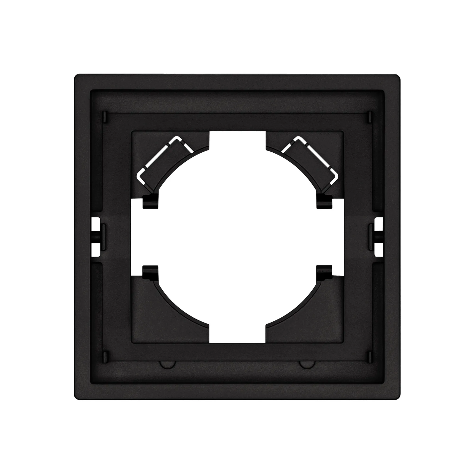 Корпус рамки выполнен в матовом черном цвете и имеет покрытие Soft-Touch, что придает изделию приятные тактильные свойства. Высота рамки составляет 9 мм, что позволяет эффективно интегрировать рамку в интерьерные решения любого уровня сложности.