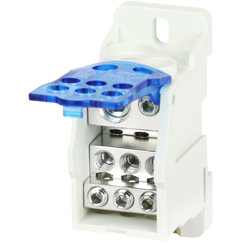 Изделие представляет собой клеммный винтовой зажим из луженой латуни в компактном корпусе из негорючего полиамида 6.6. Крепится на монтажную панель или на DIN-рейку с помощью универсального крепления. Применяется для создания упорядоченных систем распределения в силовых шкафах, квартирных распределительных щитах и для организации главной заземляющей шины.