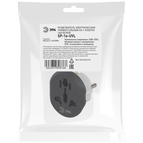Универсальный сетевой адаптер ЭРА SP-1E-UVL для дома и путешествий. Позволяет подключать бытовую технику с различными типами вилок к стандартной российской розетке 220 В. Совместим с вилками типов: A, В, С, Е, F, G, I. Максимальная нагрузка — 16А / 3500 Вт, что делает адаптер универсальным решением для подключения большинства бытовых устройств: ноутбуков, зарядных устройств, дорожной техники и пр. С заземлением.