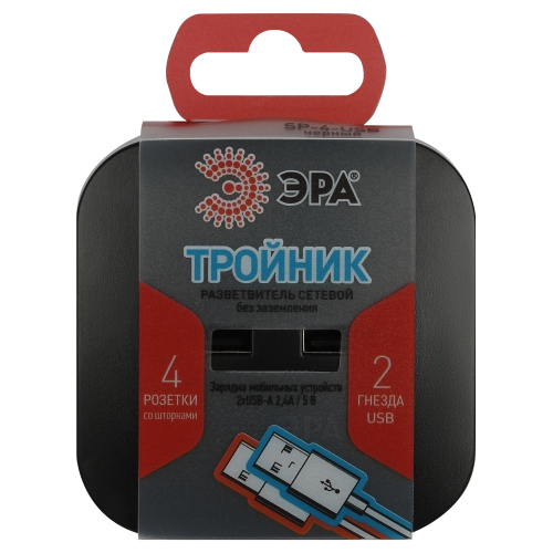 Тройник (адаптер) ЭРА с 4-мя розетками и 2-мя USB гнездами для зарядки портативных устройств. Новые тройники с USB собственного дизайна ЭРА отличаются эргономичным конструктивом и удобством в использовании. Идеален для зарядки мобильных телефонов и планшетов. Незаменим с собой в дороге. Особенно актуален, когда в помещении мало источников подключения - можно из одной розетки сделать четыре и при этом ещё заряжать 2 устройства одновременно через USB. Максимальная мощность USB разъемов: 2400 мА.
