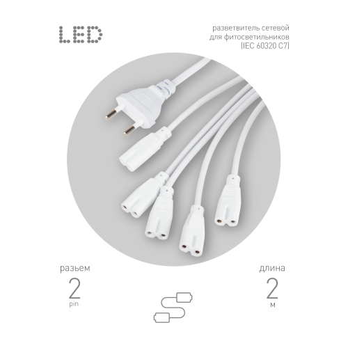 Разветвитель ЭРА FITO 5х IEC C7 (2 pin) 2 м для подключения 5 светильников. Позволяет быстро и легко организовать комплексное фитоосвещение для большой площади рассады, цветов или комнатных растений. Одна розетка — и сразу несколько фитосветильников для быстрого роста и продуктивного развития растений!