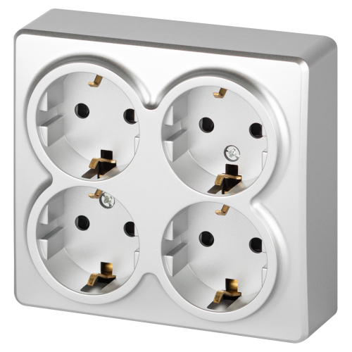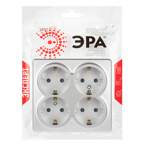 Розетка четырехместная с заземлением, со шторками серии Эра Эксперт открытой установки цвет алюминий 11-2211-03. Номинальные характеристики 16А 250В. Устройство выполнено из качественного поликарбоната, оснащёно уникальными винтовыми клеммами ЭКСПЕРТ для максимально качественного зажима кабеля в механизме.