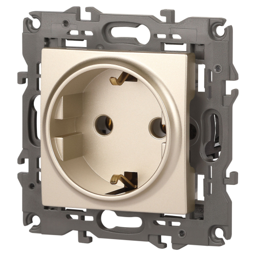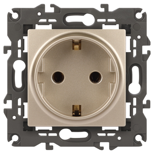Розетка с заземлением Эра Elegance шампань 14-2101-04. Оснащёна автоматическими клеммами для надёжной фиксации жил кабеля в механизме. Рамки приобретаются отдельно. Рамки Эра Elegance ПЛАСТИК: 1 пост 14-5001-хх, 2 поста 14-5002-хх, 3 поста 14-5003-хх, 4 поста 14-5004-хх, 5 постов 14-5005-хх; СТЕКЛО: 1 пост 14-5101-хх, 2 поста 14-5102-хх, 3 поста 14-5103-хх, 4 поста 14-5104-хх; МЕТАЛЛ: 1 пост 14-5201-хх, 2 поста 14-5202-хх, 3 поста 14-5203-хх, 4 поста 14-5204-хх; ДЕРЕВО: 1 пост 14-5301-хх, 2 поста 14-5302-хх, 3 поста 14-5303-хх, 4 поста 14-5304-хх (хх - код цвета: 00-прозрачный, 01-белый, белёный дуб, 02-слоновая кость, 03-алюминий, 04-шампань, 05-чёрный, чёрное дерево, 07-ясень, 09-дуб, 10-венге, 11-клён, 14-медь, 21-жёлтый, 22-оранжевый, 23-красный, 25-бордо, 26-лайм, 27-зелёный, 28-голубой, 29-синий, 30-розовый, 31-мокко, 32-серый, 41-сталь, 42-титан).
