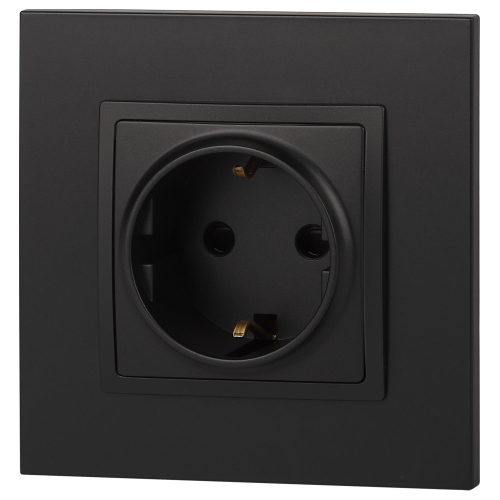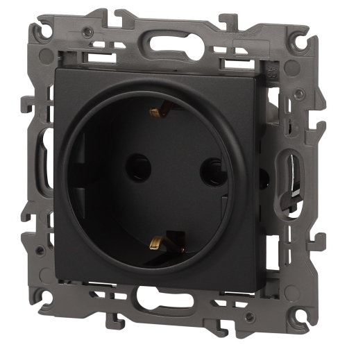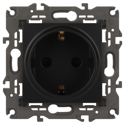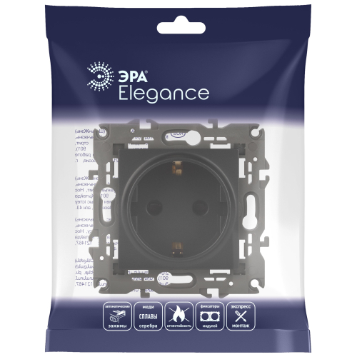 Розетка с заземлением Эра Elegance антрацит 14-2101-05. Оснащёна автоматическими клеммами для надёжной фиксации жил кабеля в механизме. Рамки приобретаются отдельно. Рамки Эра Elegance ПЛАСТИК: 1 пост 14-5001-хх, 2 поста 14-5002-хх, 3 поста 14-5003-хх, 4 поста 14-5004-хх, 5 постов 14-5005-хх; СТЕКЛО: 1 пост 14-5101-хх, 2 поста 14-5102-хх, 3 поста 14-5103-хх, 4 поста 14-5104-хх; МЕТАЛЛ: 1 пост 14-5201-хх, 2 поста 14-5202-хх, 3 поста 14-5203-хх, 4 поста 14-5204-хх; ДЕРЕВО: 1 пост 14-5301-хх, 2 поста 14-5302-хх, 3 поста 14-5303-хх, 4 поста 14-5304-хх (хх - код цвета: 00-прозрачный, 01-белый, белёный дуб, 02-слоновая кость, 03-алюминий, 04-шампань, 05-чёрный, чёрное дерево, 07-ясень, 09-дуб, 10-венге, 11-клён, 14-медь, 21-жёлтый, 22-оранжевый, 23-красный, 25-бордо, 26-лайм, 27-зелёный, 28-голубой, 29-синий, 30-розовый, 31-мокко, 32-серый, 41-сталь, 42-титан).