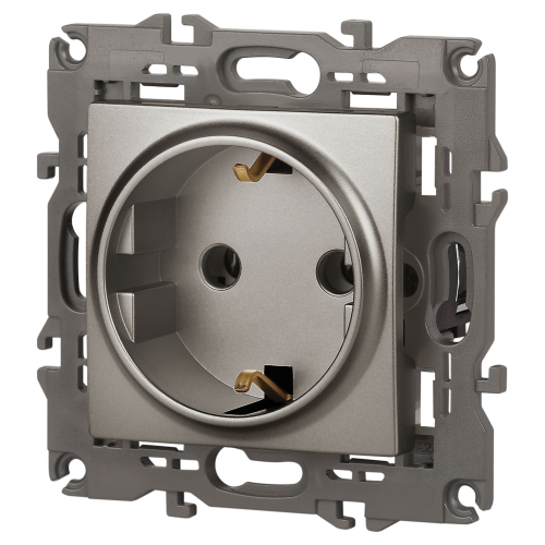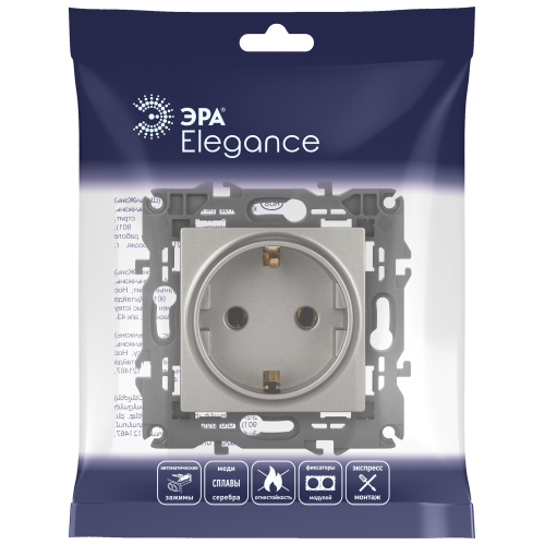 Розетка с заземлением серии Эра Elegance цвет титан 14-2101-16. Характеристики 16А 250В. Оснащена автоматическими клеммами для надёжной фиксации жил кабеля в механизме. Рамки приобретаются отдельно.