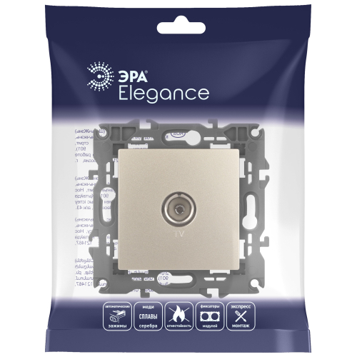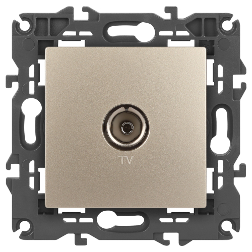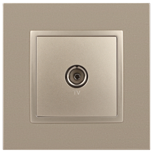 Розетка телевизионная одиночная серии Эра Elegance цвет шампань 14-3101-04. Рамки приобретаются отдельно. Рамки Эра Elegance ПЛАСТИК: 1 пост 14-5001-хх, 2 поста 14-5002-хх, 3 поста 14-5003-хх, 4 поста 14-5004-хх, 5 постов 14-5005-хх; СТЕКЛО: 1 пост 14-5101-хх, 2 поста 14-5102-хх, 3 поста 14-5103-хх, 4 поста 14-5104-хх; МЕТАЛЛ: 1 пост 14-5201-хх, 2 поста 14-5202-хх, 3 поста 14-5203-хх, 4 поста 14-5204-хх; ДЕРЕВО: 1 пост 14-5301-хх, 2 поста 14-5302-хх, 3 поста 14-5303-хх, 4 поста 14-5304-хх (хх - код цвета: 00-прозрачный, 01-белый, белёный дуб, 02-слоновая кость, 03-алюминий, 04-шампань, 05-чёрный, чёрное дерево, 07-ясень, 09-дуб, 10-венге, 11-клён, 14-медь, 21-жёлтый, 22-оранжевый, 23-красный, 25-бордо, 26-лайм, 27-зелёный, 28-голубой, 29-синий, 30-розовый, 31-мокко, 32-серый, 41-сталь, 42-титан).