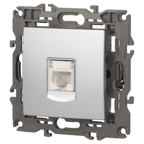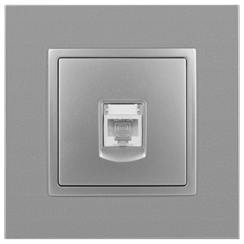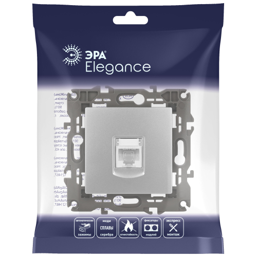 Розетка интернет RJ45 серии Эра Elegance цвет алюминий 14-3107-03. Рамки приобретаются отдельно. Рамки Эра Elegance ПЛАСТИК: 1 пост 14-5001-хх, 2 поста 14-5002-хх, 3 поста 14-5003-хх, 4 поста 14-5004-хх, 5 постов 14-5005-хх; СТЕКЛО: 1 пост 14-5101-хх, 2 поста 14-5102-хх, 3 поста 14-5103-хх, 4 поста 14-5104-хх; МЕТАЛЛ: 1 пост 14-5201-хх, 2 поста 14-5202-хх, 3 поста 14-5203-хх, 4 поста 14-5204-хх; ДЕРЕВО: 1 пост 14-5301-хх, 2 поста 14-5302-хх, 3 поста 14-5303-хх, 4 поста 14-5304-хх (хх - код цвета: 00-прозрачный, 01-белый, белёный дуб, 02-слоновая кость, 03-алюминий, 04-шампань, 05-чёрный, чёрное дерево, 07-ясень, 09-дуб, 10-венге, 11-клён, 14-медь, 21-жёлтый, 22-оранжевый, 23-красный, 25-бордо, 26-лайм, 27-зелёный, 28-голубой, 29-синий, 30-розовый, 31-мокко, 32-серый, 41-сталь, 42-титан).