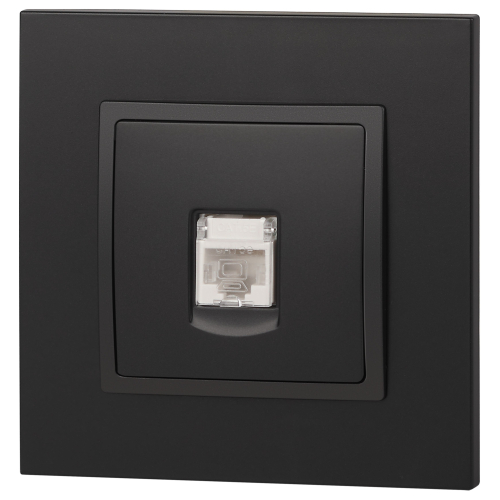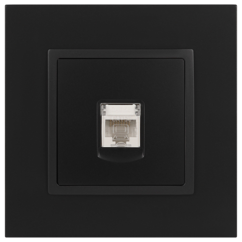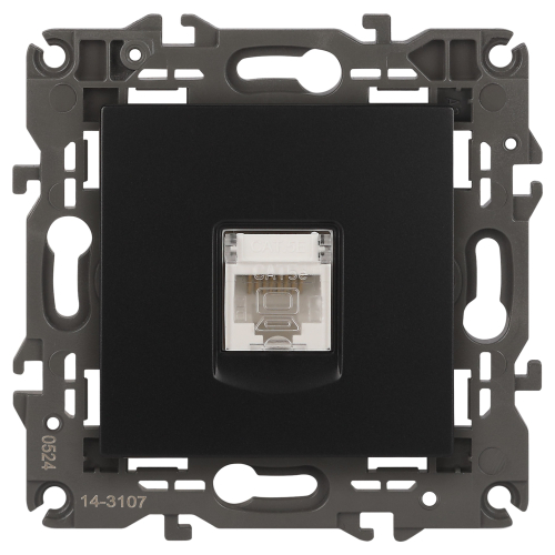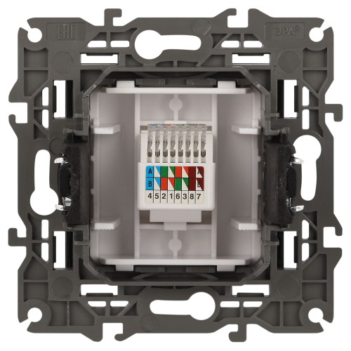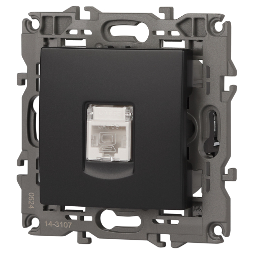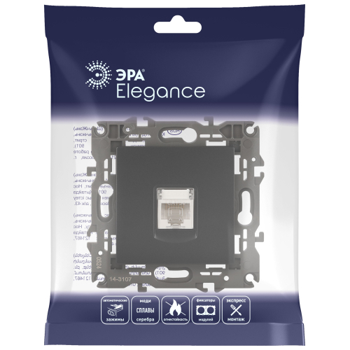 Розетка интернет RJ45 серии Эра Elegance цвет антрацит 14-3107-05. Рамки приобретаются отдельно. Рамки Эра Elegance ПЛАСТИК: 1 пост 14-5001-хх, 2 поста 14-5002-хх, 3 поста 14-5003-хх, 4 поста 14-5004-хх, 5 постов 14-5005-хх; СТЕКЛО: 1 пост 14-5101-хх, 2 поста 14-5102-хх, 3 поста 14-5103-хх, 4 поста 14-5104-хх; МЕТАЛЛ: 1 пост 14-5201-хх, 2 поста 14-5202-хх, 3 поста 14-5203-хх, 4 поста 14-5204-хх; ДЕРЕВО: 1 пост 14-5301-хх, 2 поста 14-5302-хх, 3 поста 14-5303-хх, 4 поста 14-5304-хх (хх - код цвета: 00-прозрачный, 01-белый, белёный дуб, 02-слоновая кость, 03-алюминий, 04-шампань, 05-чёрный, чёрное дерево, 07-ясень, 09-дуб, 10-венге, 11-клён, 14-медь, 21-жёлтый, 22-оранжевый, 23-красный, 25-бордо, 26-лайм, 27-зелёный, 28-голубой, 29-синий, 30-розовый, 31-мокко, 32-серый, 41-сталь, 42-титан).