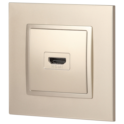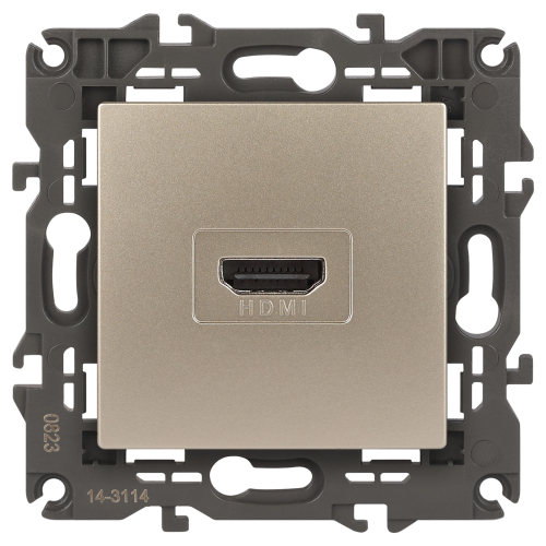 Розетка HDMI серии Эра Elegance цвет шампань 14-3114-04. Рамки приобретаются отдельно. Рамки Эра Elegance ПЛАСТИК: 1 пост 14-5001-хх, 2 поста 14-5002-хх, 3 поста 14-5003-хх, 4 поста 14-5004-хх, 5 постов 14-5005-хх; СТЕКЛО: 1 пост 14-5101-хх, 2 поста 14-5102-хх, 3 поста 14-5103-хх, 4 поста 14-5104-хх; МЕТАЛЛ: 1 пост 14-5201-хх, 2 поста 14-5202-хх, 3 поста 14-5203-хх, 4 поста 14-5204-хх; ДЕРЕВО: 1 пост 14-5301-хх, 2 поста 14-5302-хх, 3 поста 14-5303-хх, 4 поста 14-5304-хх (хх - код цвета: 00-прозрачный, 01-белый, белёный дуб, 02-слоновая кость, 03-алюминий, 04-шампань, 05-чёрный, чёрное дерево, 07-ясень, 09-дуб, 10-венге, 11-клён, 14-медь, 21-жёлтый, 22-оранжевый, 23-красный, 25-бордо, 26-лайм, 27-зелёный, 28-голубой, 29-синий, 30-розовый, 31-мокко, 32-серый, 41-сталь, 42-титан).