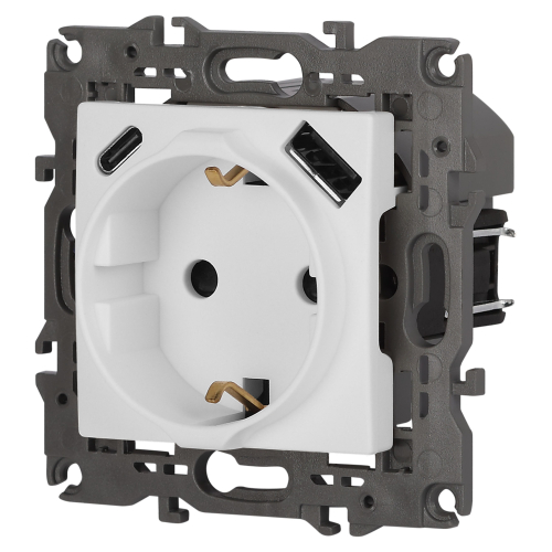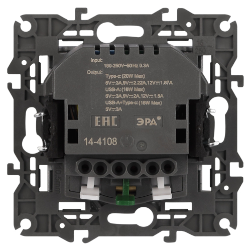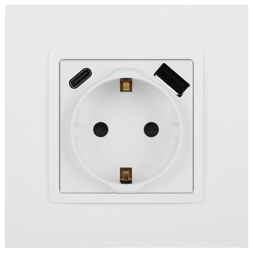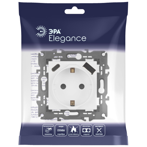 Розетка с USB A+C серии Эра Elegance 14-4108-01М цвет белый матовый. Номинальные характеристики: розетка силовая – 16А 250В. Розетка USB type A – 3A 5В. Розетка USB type C – 3A 5В. Рамки приобретаются отдельно