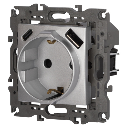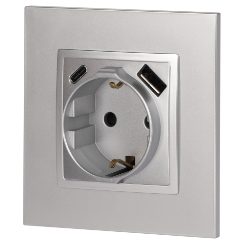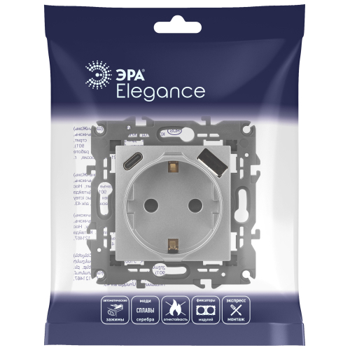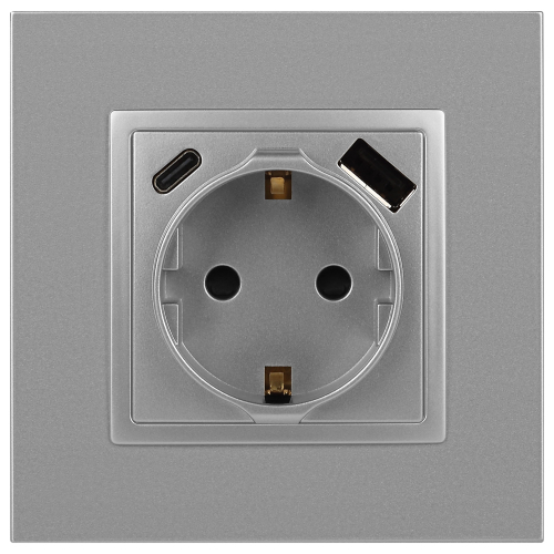 Розетка с USB A+C серии Эра Elegance 14-4108-03 цвет алюминий. Номинальные характеристики: розетка силовая – 16А 250В. Розетка USB type A – 3A 5В. Розетка USB type C – 3A 5В. Рамки приобретаются отдельно