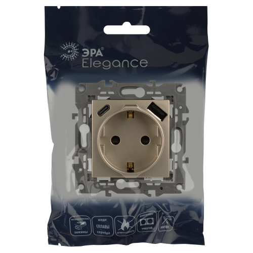 Розетка с USB A+C серии Эра Elegance 14-4108-04 цвет шампань. Номинальные характеристики: розетка силовая – 16А 250В. Розетка USB type A – 3A 5В. Розетка USB type C – 3A 5В. Рамки приобретаются отдельно