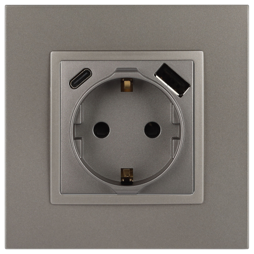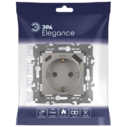 Розетка с USB A+C серии Эра Elegance 14-4108-16 цвет титан. Номинальные характеристики: розетка силовая – 16А 250В. Розетка USB type A – 3A 5В. Розетка USB type C – 3A 5В. Рамки приобретаются отдельно