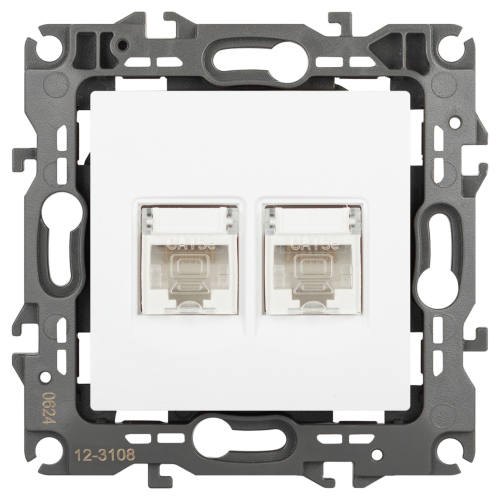 Розетка информационная двойная 2хRJ45 серии Эра 12 скрытой установки механизм цвет белый матовый 12-3108-01М. Сделана из поликарбоната. Монтаж в подрозетник производится и на лапки, и на винты. Рамки приобретаются отдельно.