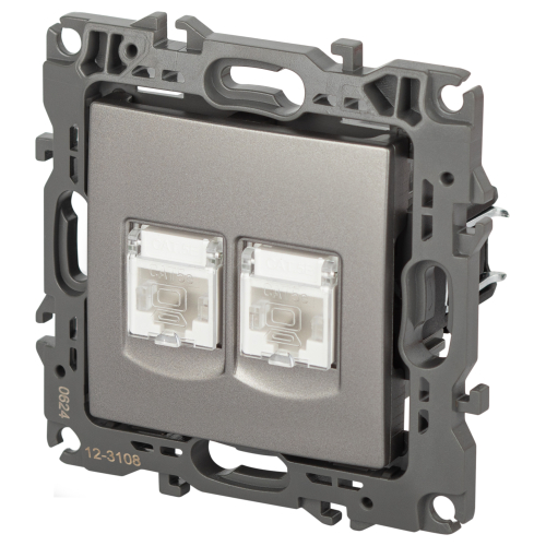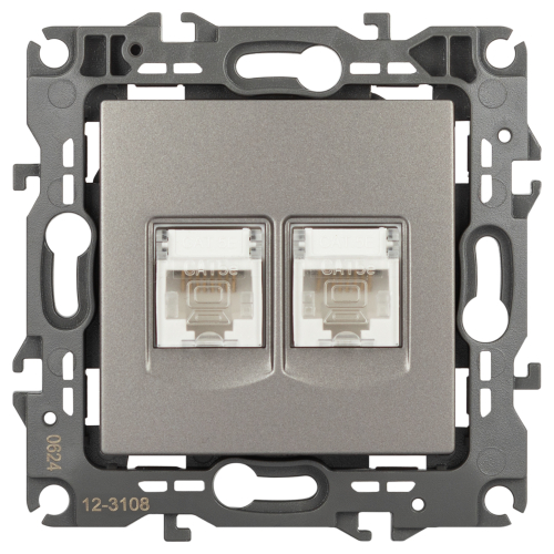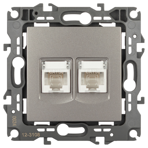 Розетка информационная двойная 2хRJ45 серии Эра 12 скрытой установки механизм цвет титан 12-3108-16. Сделана из поликарбоната. Монтаж в подрозетник производится и на лапки, и на винты. Рамки приобретаются отдельно.