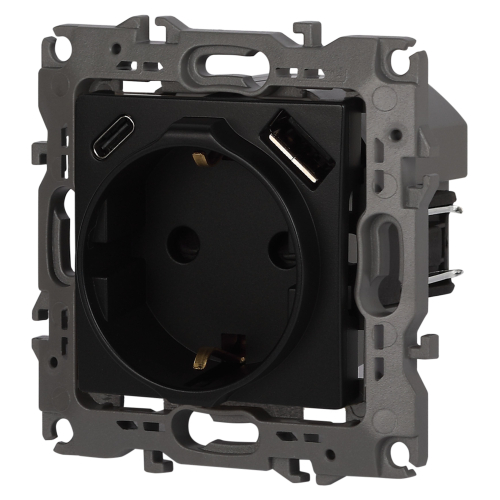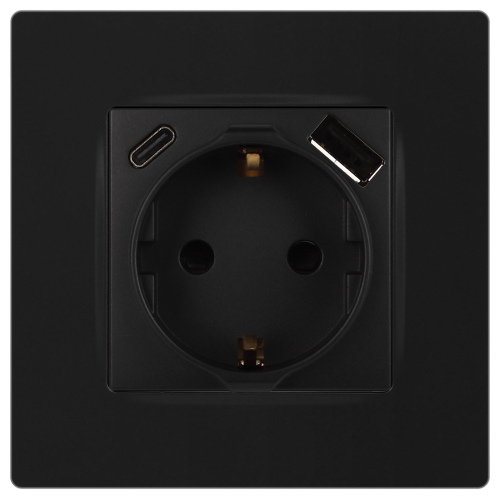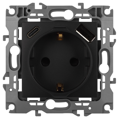 Розетка с USB A+C серии Эра12 12-4108-05 цвет антрацит. Номинальные характеристики: розетка силовая – 16А 250В. Розетка USB type A – 3A 5В. Розетка USB type C – 3A 5В. Рамки приобретаются отдельно