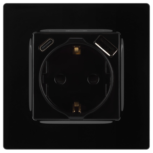 Розетка с USB A+C серии Эра12 12-4108-06 цвет чёрный глянец. Номинальные характеристики: розетка силовая – 16А 250В. Розетка USB type A – 3A 5В. Розетка USB type C – 3A 5В. Рамки приобретаются отдельно.