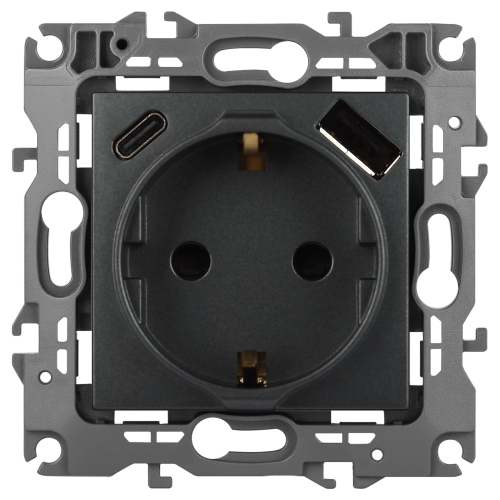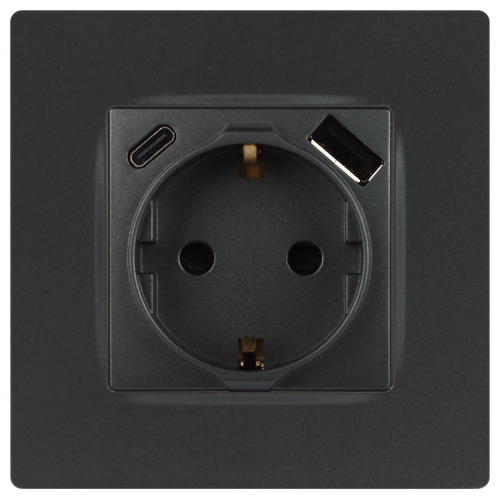 Розетка с USB A+C серии Эра12 12-4108-12 цвет графит. Номинальные характеристики: розетка силовая – 16А 250В. Розетка USB type A – 3A 5В. Розетка USB type C – 3A 5В. Рамки приобретаются отдельно