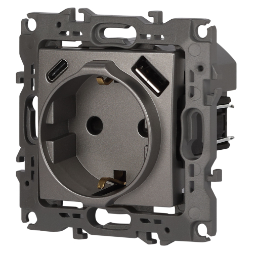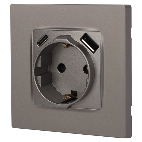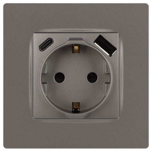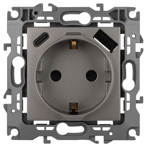 Розетка с USB A+C серии Эра12 12-4108-16 цвет титан. Номинальные характеристики: розетка силовая – 16А 250В. Розетка USB type A – 3A 5В. Розетка USB type C – 3A 5В. Рамки приобретаются отдельно