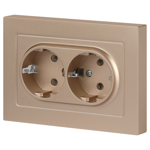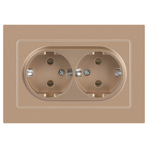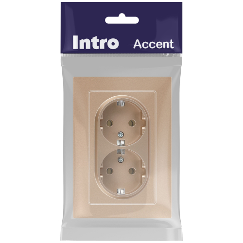 Розетка двойная с заземлением серии Intro Accent скрытой установки цвет шампань 6-205-04. Номинальные характеристики 16А 250В. Выполнена из негорючего термопласта, оснащена винтовыми клеммами. Парные клеммы обеспечивают соединение шлейфом. Монтаж в подрозетник производится и на лапки, и на винты.