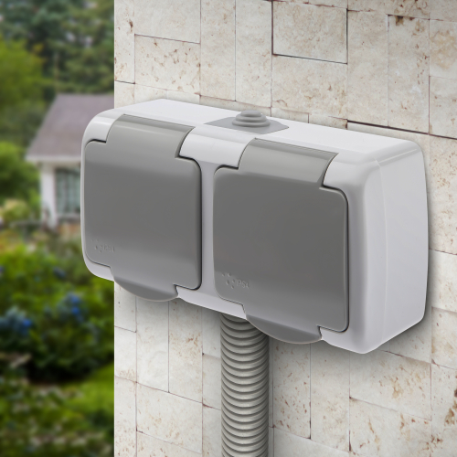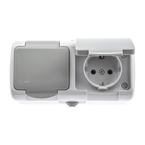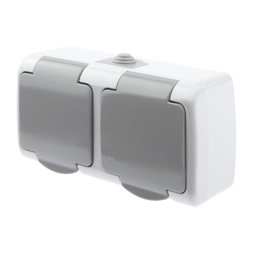 Розетка 2х2P+E Schuko, 16А-250В, IP54, ОУ, Atlantic, серый
