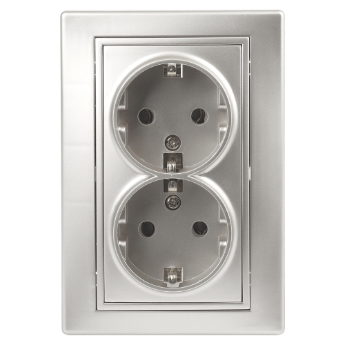 Розетка двойная 2-я серии Intro Plano скрытой установки цвет алюминий 1-205-03. Номинальные характеристики 16А 250В. Розетка выполнена из керамики, укомплектована одноместной рамкой, оснащена винтовыми клеммами. Клеммы с двумя отверстиями позволяют соединять соседние розетки шлейфом. Установка в подрозетник производится как на монтажные лапки, так и на винты.
