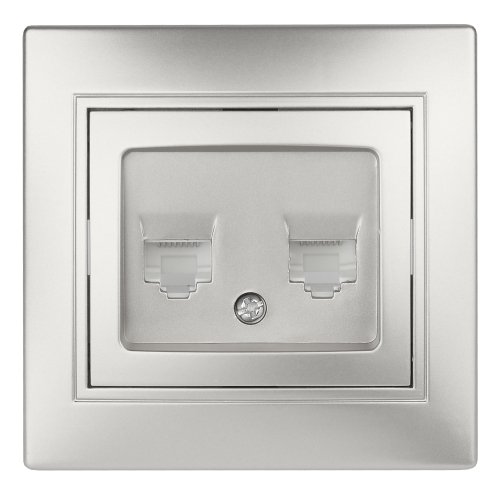 Розетка RJ45 серии Intro Plano скрытой установки цвет алюминий 1-304-03. Номинальные характеристики . Розетка выполнена из термопласта, укомплектована одноместной рамкой. Для установки 2-х и более устройств в несколько подрозетников в ряд дополнительно используются многоместные рамки: 2-х постовая - 1-502-хх, 3-х постовая 1-503-хх, 4-х постовая - 1-504-хх (где хх - цветовой код: 01 - белый, 02 - слоновая кость, 03 - алюминий, 04 - шампань, 05 - антрацит, 10 - венге, 11 - сосна).