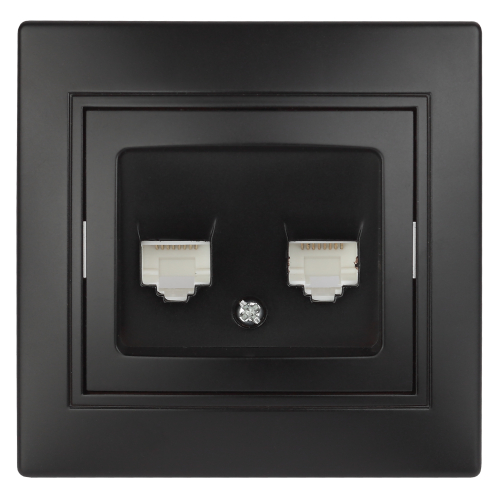 Розетка RJ45 серии Intro Plano скрытой установки цвет антрацит 1-304-05. Номинальные характеристики . Розетка выполнена из термопласта, укомплектована одноместной рамкой. Для установки 2-х и более устройств в несколько подрозетников в ряд дополнительно используются многоместные рамки: 2-х постовая - 1-502-хх, 3-х постовая 1-503-хх, 4-х постовая - 1-504-хх (где хх - цветовой код: 01 - белый, 02 - слоновая кость, 03 - алюминий, 04 - шампань, 05 - антрацит, 10 - венге, 11 - сосна).