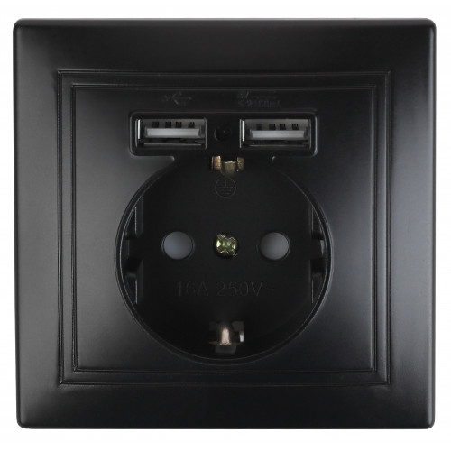 Розетка с заземлением 2P+E Schuko со шторками, 16А-250В + 2хUSB 5В-2,1А, IP20, СУ, антрацит Intro Plano 1-410-05