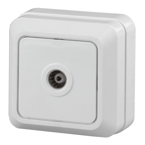 Розетка TV одиночная Intro серии Quadro открытой установки цвет белый 2-301-01; номинальные характеристики: 16А 250В, IP20. Розетка выполнена из негорючего термопласта, стали и латуни, оснащена винтовыми зажимами.