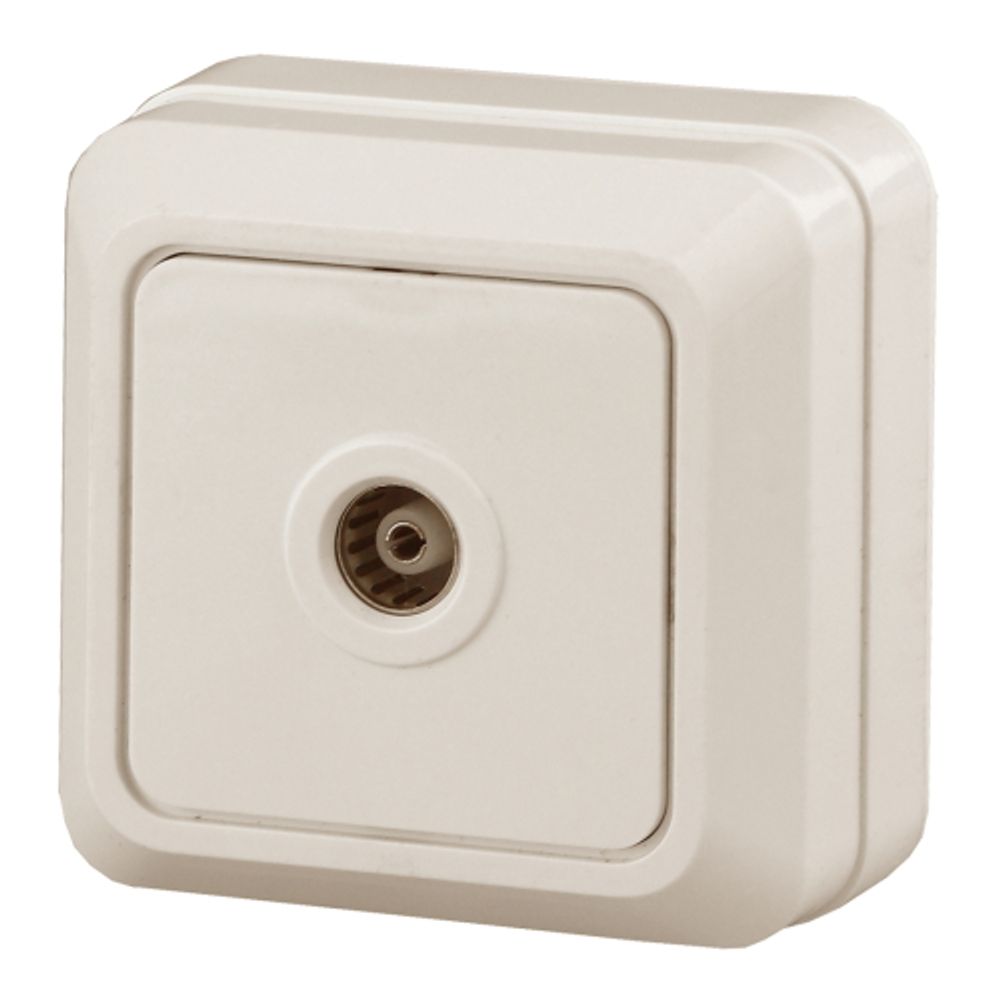 Розетка TV одиночная Intro серии Quadro открытой установки, цвет слоновая кость 2-301-02; номинальные характеристики: 16А 250В, IP20. Розетка выполнена из негорючего термопласта, стали и латуни, оснащена винтовыми зажимами.