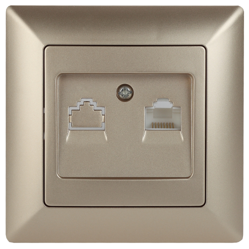 Розетка RJ45 серии Intro Solo скрытой установки цвет шампань 4-303-04. Розетка выполнена из термопласта, укомплектована одноместной рамкой. Для установки 2-х и более устройств в несколько подрозетников в ряд дополнительно используются многоместные рамки: 2-х постовая - 4-502-хх, 3-х постовая 4-503-хх, 4-х постовая - 4-504-хх (где хх - цветовой код: 01 - белый, 02 - слоновая кость, 03 - алюминий, 04 - шампань, 05 - антрацит, 10 - венге, 11 - сосна).