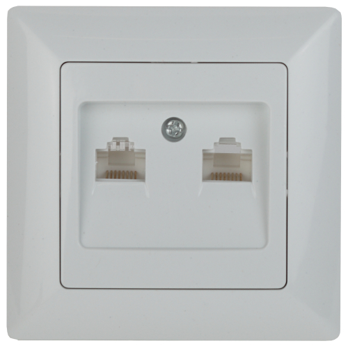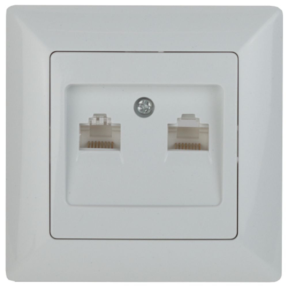 Розетка информационная на два порта 2xRJ45, серии Solo, скрытой установки 4-304-01 цвет белый. Выполнена из термопластика, укомплектована одноместной рамкой.