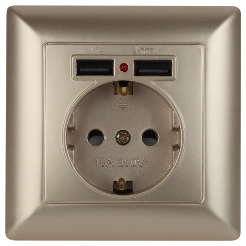 Розетка с USB со шторкой серии Intro Solo скрытой установки цвет шампань 4-410-04. Номинальные характеристики 16А 250В/2,1А-5В . Розетка выполнена из негорючего термопласта, укомплектована одноместной рамкой, оснащена винтовыми клеммами. Клеммы с двумя отверстиями позволяют соединять соседние розетки шлейфом. Установка в подрозетник производится как на монтажные лапки, так и на винты.