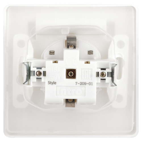 Розетка с заземлением со шторками с крышкой серии Intro Style скрытой установки цвет белый 7-209-01 со степенью защиты IP44. Номинальные характеристики 16А 250В . Розетка выполнена из термопласта, укомплектована одноместной рамкой, оснащена винтовыми клеммами. Клеммы с двумя отверстиями позволяют соединять соседние розетки шлейфом. Установка в подрозетник производится как на монтажные лапки, так и на винты.