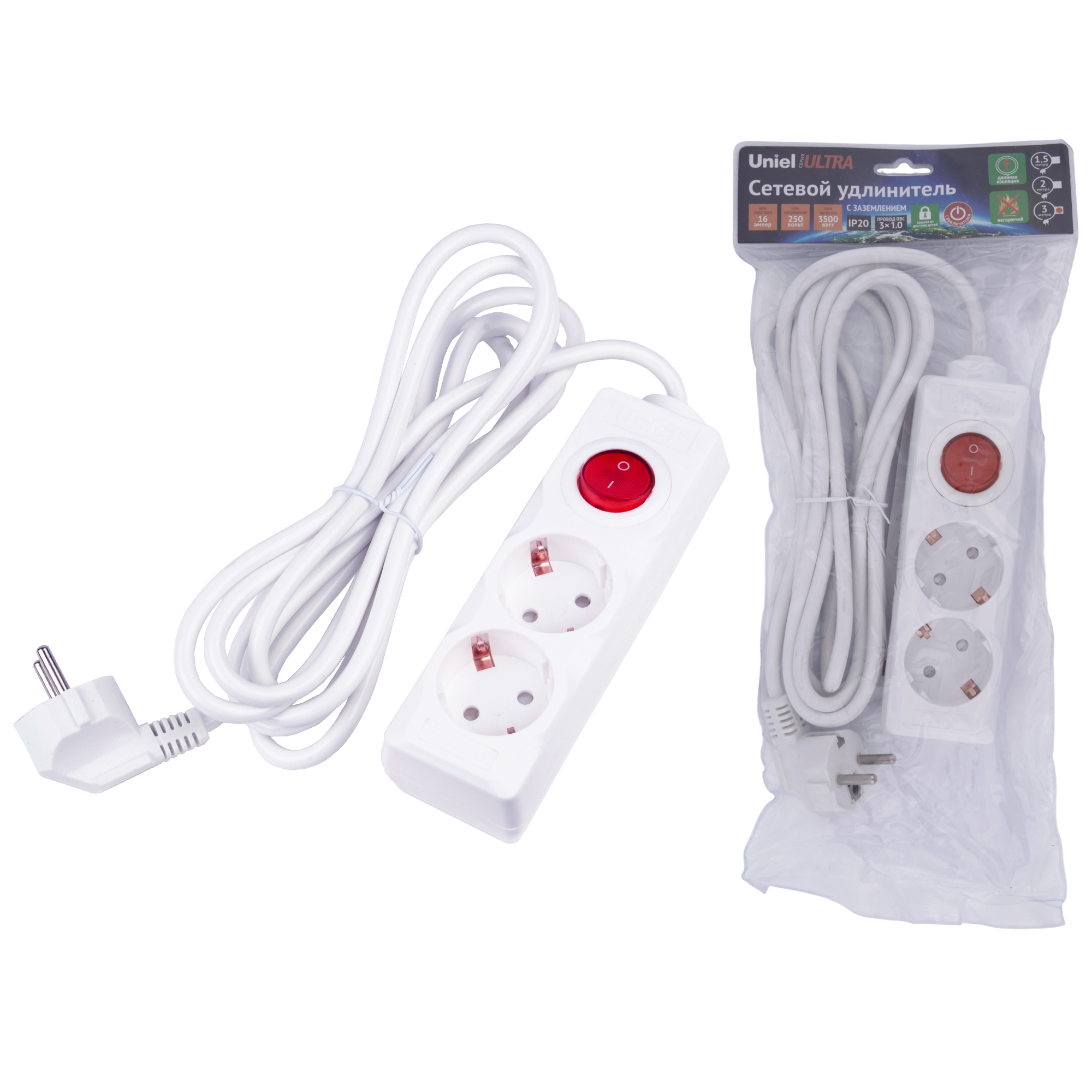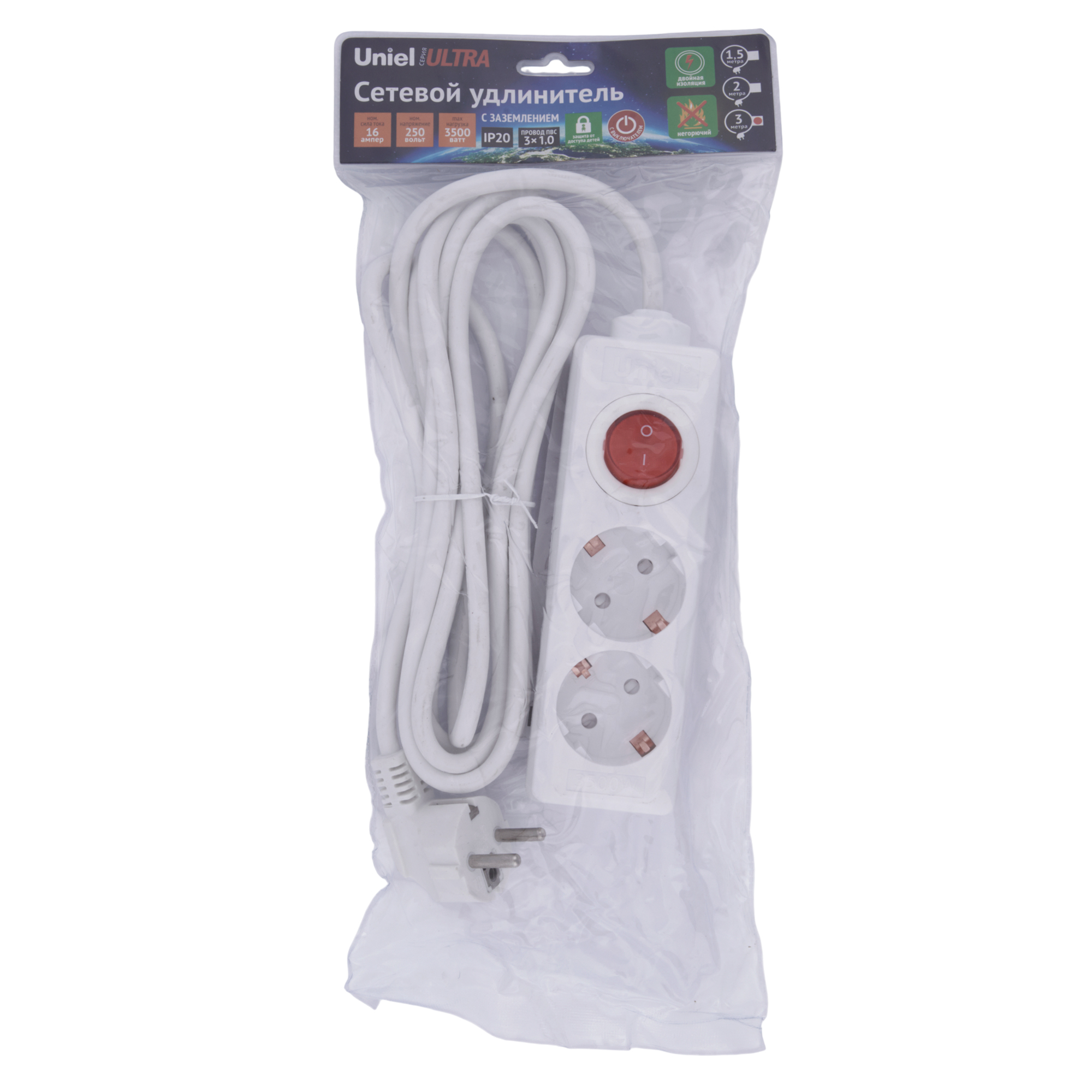 Удлинитель S-GCU2-3B WHITE серии Ultra предназначен для подключения электрических приборов в быту. Отличительными особенностями удлинителя являются заземление, негорючий ударопрочный корпус, эргономичная вилка, двойная изоляция провода, защита от доступа детей и выключатель на корпусе. Максимальная нагрузка - 3500 Вт. Количество гнезд - 2 шт. Материал изоляции кабеля - ПВХ. Степень пылевлагозащиты - IP 20. Корпус удлинителя изготовлен из пластика, цвет корпуса - белый. Удобный выключатель расположен на корпусе. Длина кабеля - 3 м. Удлинитель - незаменимый помощник в любом доме. Размер упаковки - ДхШхВ 45х160х350 мм. Общий вес комплекта - 390 г. Гарантия - 1 год. Срок службы - 5 лет.