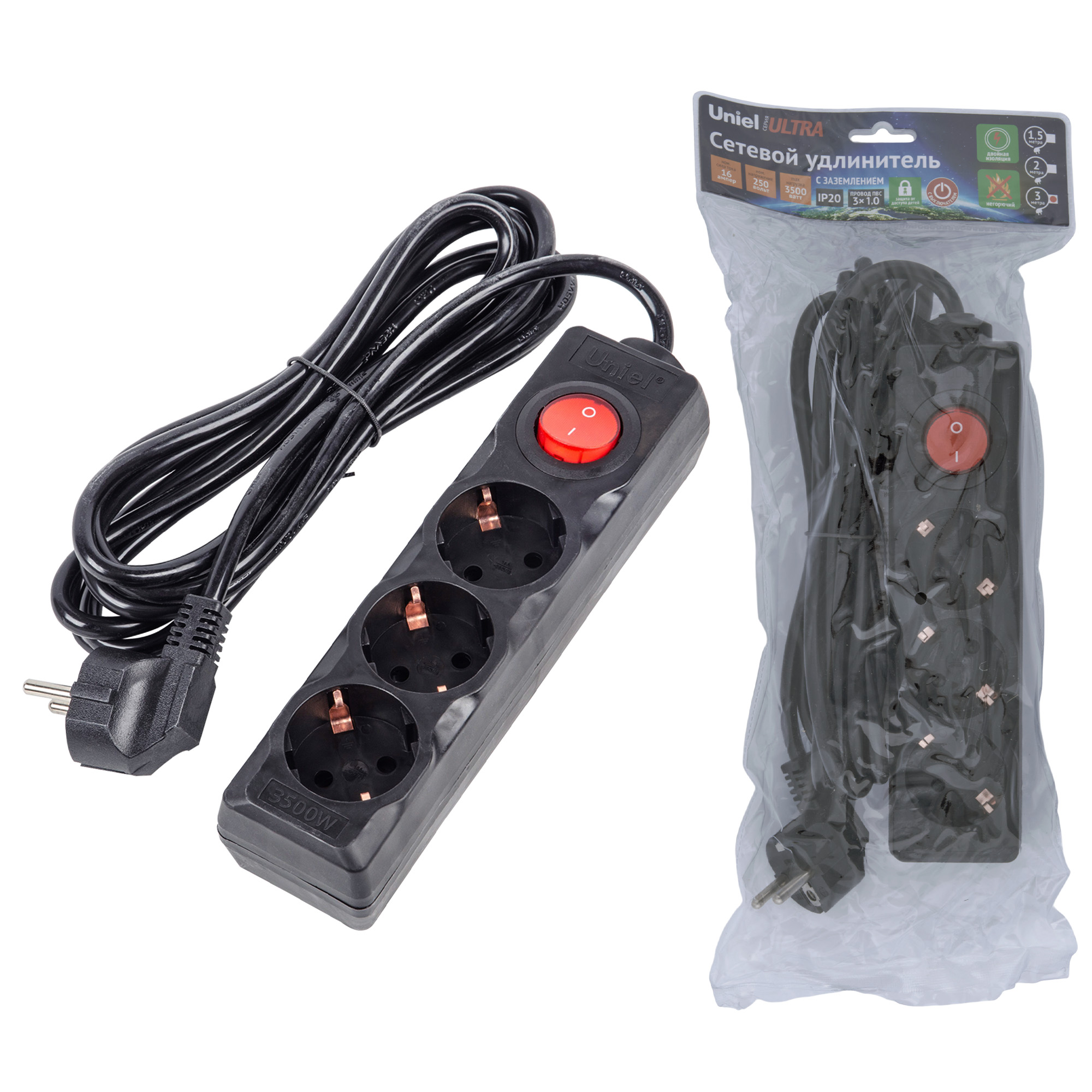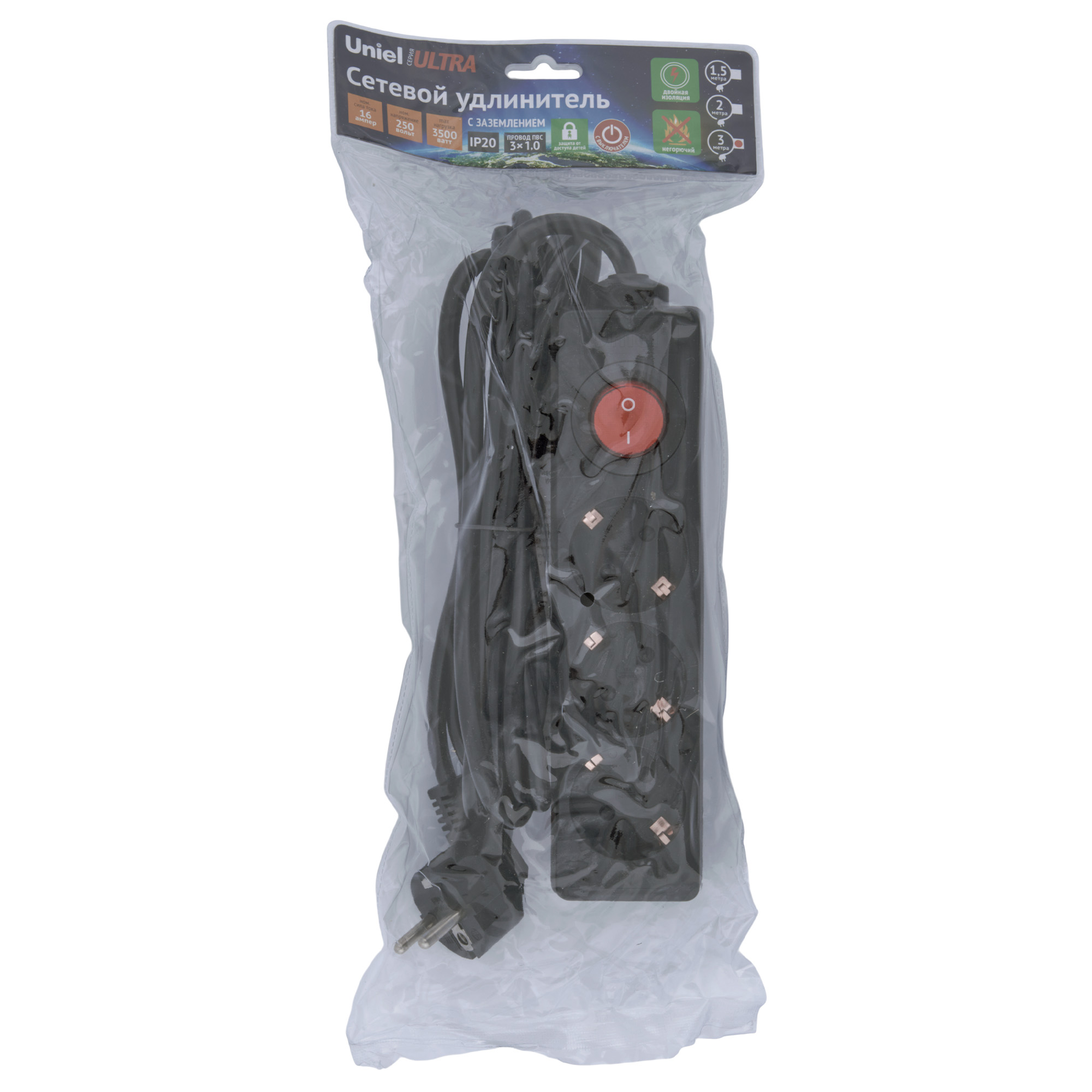 Удлинитель S-GCU3-3B BLACK серии Ultra предназначен для подключения электрических приборов в быту. Отличительными особенностями удлинителя являются заземление, негорючий ударопрочный корпус, эргономичная вилка, двойная изоляция провода, защита от доступа детей и выключатель на корпусе. Максимальная нагрузка - 3500 Вт. Количество гнезд - 3 шт. Материал изоляции кабеля - ПВХ. Степень пылевлагозащиты - IP 20. Корпус удлинителя изготовлен из пластика, цвет корпуса - черный. Удобный выключатель расположен на корпусе. Длина кабеля - 3 м. Удлинитель - незаменимый помощник в любом доме. Размер упаковки - ДхШхВ 45х160х350 мм. Общий вес комплекта - 422 г. Гарантия - 1 год. Срок службы - 5 лет.