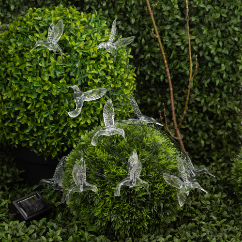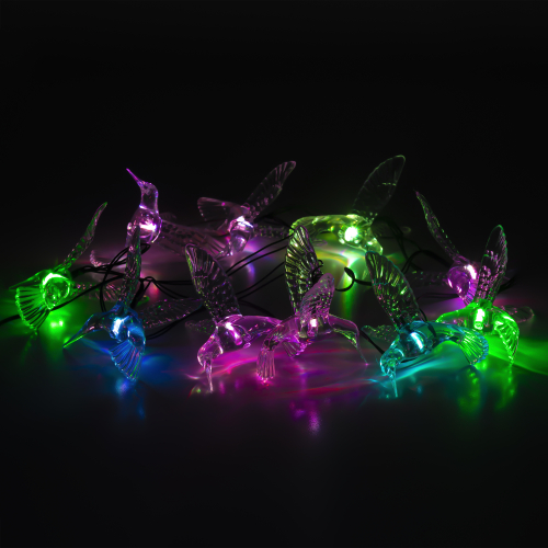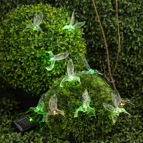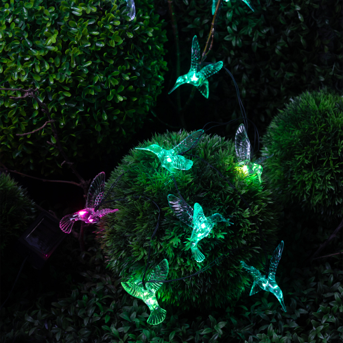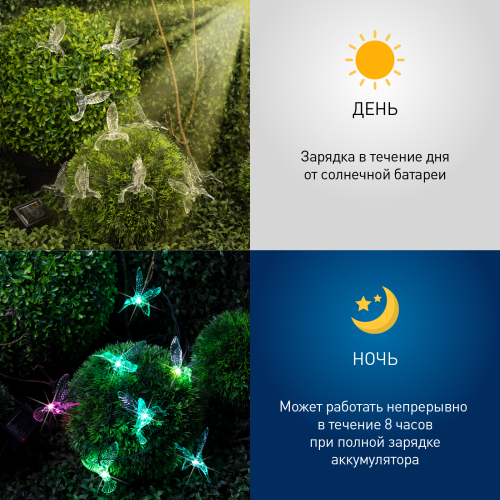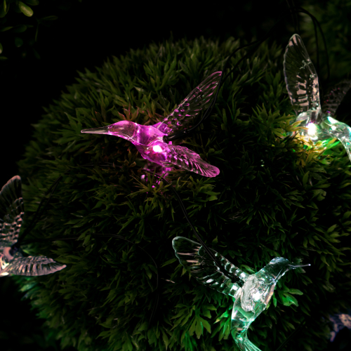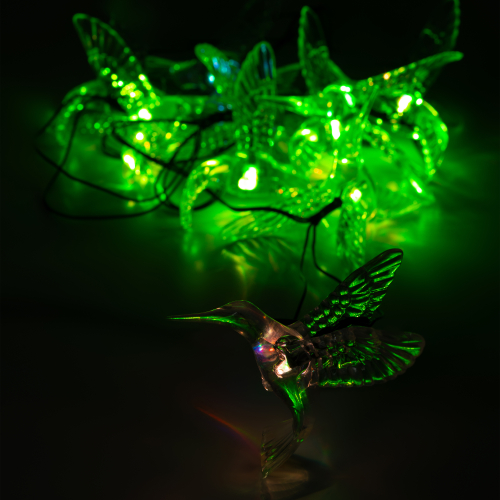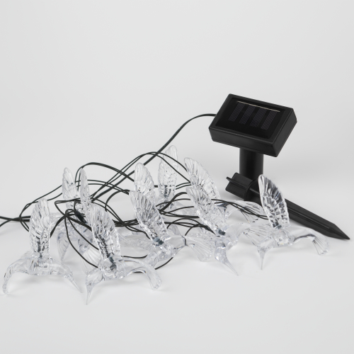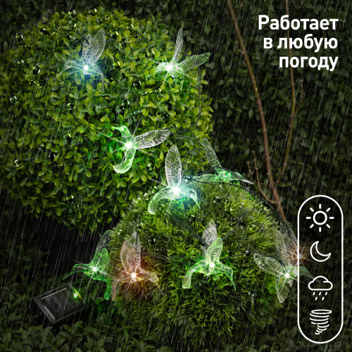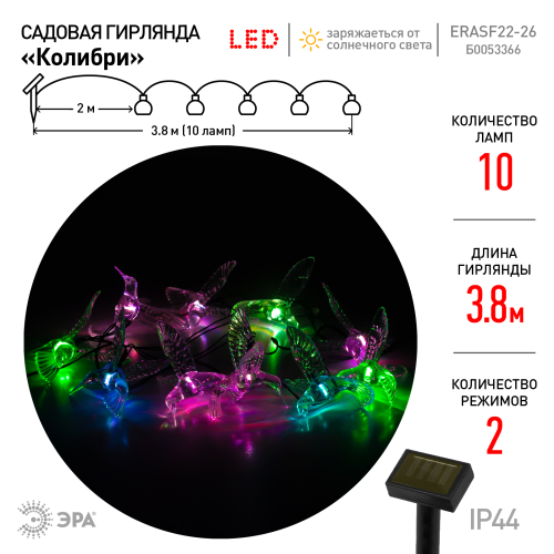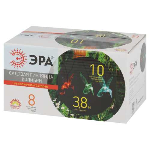 Садовая гирлянда ERASF22-26 "Колибри" 3.8 м от компании ЭРА станет оригинальным декором вашего загородного участка! Этот уличный светодиодный светильник добавит атмосферу праздничности и воздушности вашему саду - повесьте его на куст, подсветите ветви дерева или дверь в дом. Состоит из 10 прозрачных фигурок в виде колибри, подсвеченных светодиодами с разноцветным свечением. Гирлянда работает на солнечной батарее - этот тип получения энергии является наиболее экологичным, энергоемким, а также бесшумным. Питание происходит во включенном режиме, днем, а с наступлением ночи гирлянда автоматически включается и радует Вас до 8 часов своим свечением. 2 режима - постоянный и мигающий - можете менять под настроение. Садовый светильник можно оставлять на улице в непогоду, благодаря высокой степени пыле- и влагозащиты IP44. Уличная гирлянда на солнечной батарее от бренда ЭРА - выигрышный вариант для украшения территории сада.