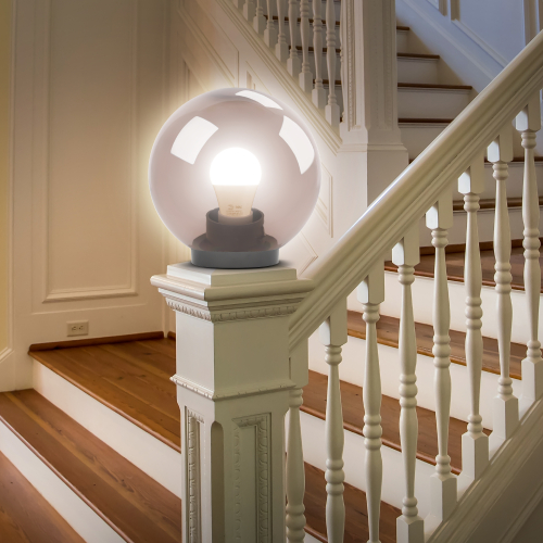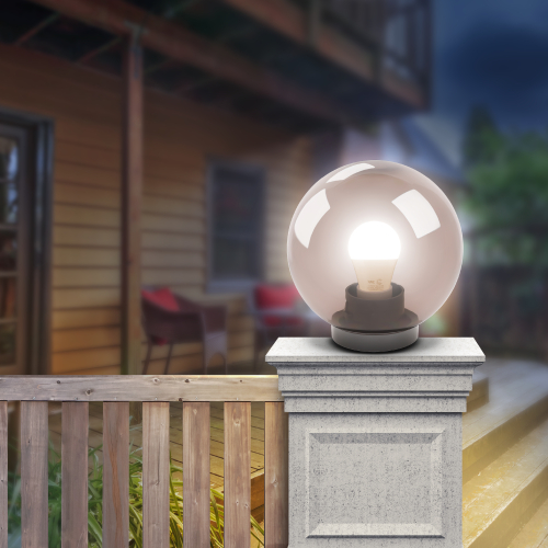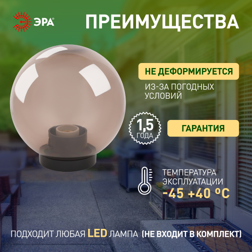 Дизайн с учетом европейских тенденций в освещении. Не подвержен коррозии, деформации под воздействием погодных условий (основание выполнено из поликарбоната, рассеиватель- полиметилметакрилата). Подходит любая светодиодная лампа, имеющая габариты не более D118мм, H=«D шара»-30мм
