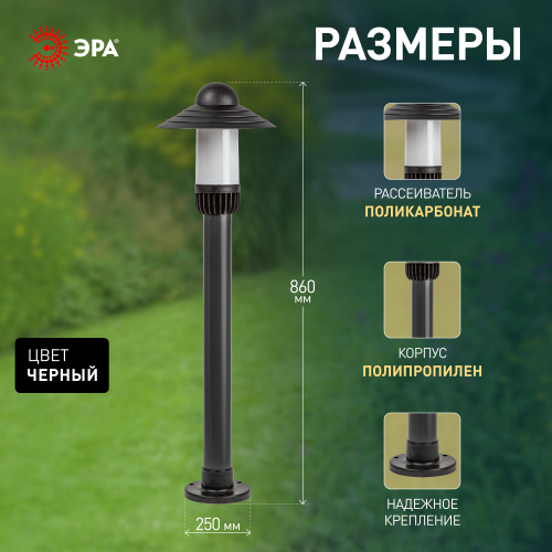 Корпус уличных садово-парковых светильников ЭРА серии "Поллар" изготовлен из высококачественного полипропилена - устойчивого к осадкам, заморозкам и прямым солнечным лучам материала. Плафон из матового поликарбоната смягчает блики и создаёт ровный рассеянный свет.